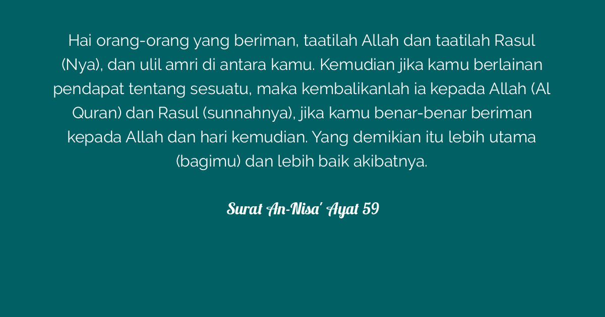 Related : Surah An Nisa Ayat 59 : Ya ayyuha allatheena amanoo ateeaaoo allaha waateeaaoo alrrasoola waolee alamri minkum fain tanazaaatum fee shayin faruddoohu ila allahi waalrrasooli in kuntum tuminoona biallahi waalyawmi alakhiri thalika khayrun waahsanu taweelan..